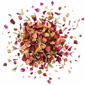 Zutaten: Apfelstücke, Weinbeeren, Hibiskusblüten, Hagebuttenschalen, Aroma, Steviablätter, Rosmarin, Rhabarberstücke, Säuerungsmittel (Zitronensäure), Rosenblütenblätter