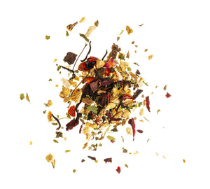 Ingrédients : cynorrhodon*, hibiscus*, écorce d'orange*, betterave rouge*, baies de sureau*, pomme*, gingembre, stévia, menthe (marocaine), canneberge, raisins de Corinthe, pétales de rose, sauge.